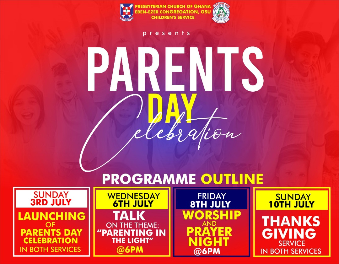 SUNDAY 3RD JULY 2022 - LAUNCHING OF PARENTS DAY CELEBRATION IN BOTH SERVICES WEDNESDAY 6TH JULY 2022- TALK ON THE THEME "PARENTING IN THE LIGHT" @ 6.00 PM FRIDAY 8TH JULY 2022- WORSHIP & PRAYER NIGHT @ 6.00 PM SUNDAY 10TH JULY 2022- THANKSGIVING SERVICE IN BOTH SERVICES