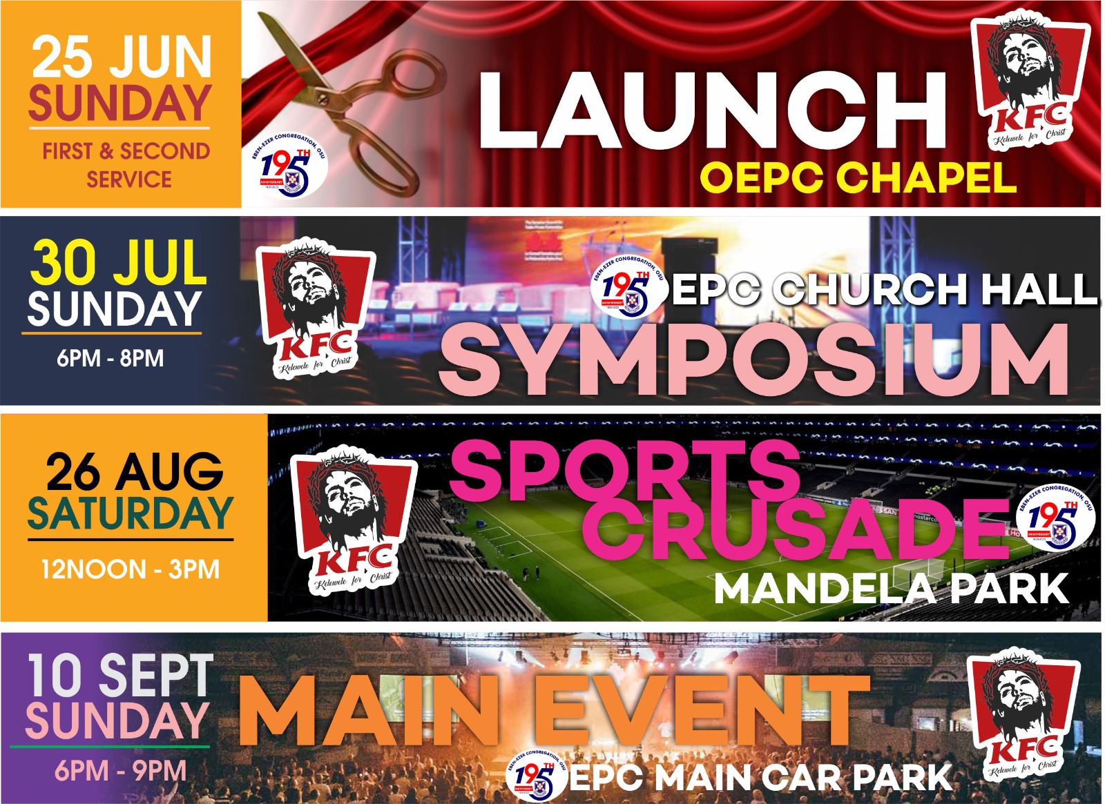 SUNDAY 25TH JUNE 2023: LAUNCHING OF KFC @ BOTH SERVICES @ OEPC CHAPEL SUNDAY 30TH JULY 2023: SYMPOSIUM @ THE OEPC CHURCH HALL FROM 6.00 PM TO 8.00 PM SATURDAY 26TH AUGUST 2023: SPORTS CRUSADE @ MANDELA PARK FROM 12.00 N00N TO 3.00 PM