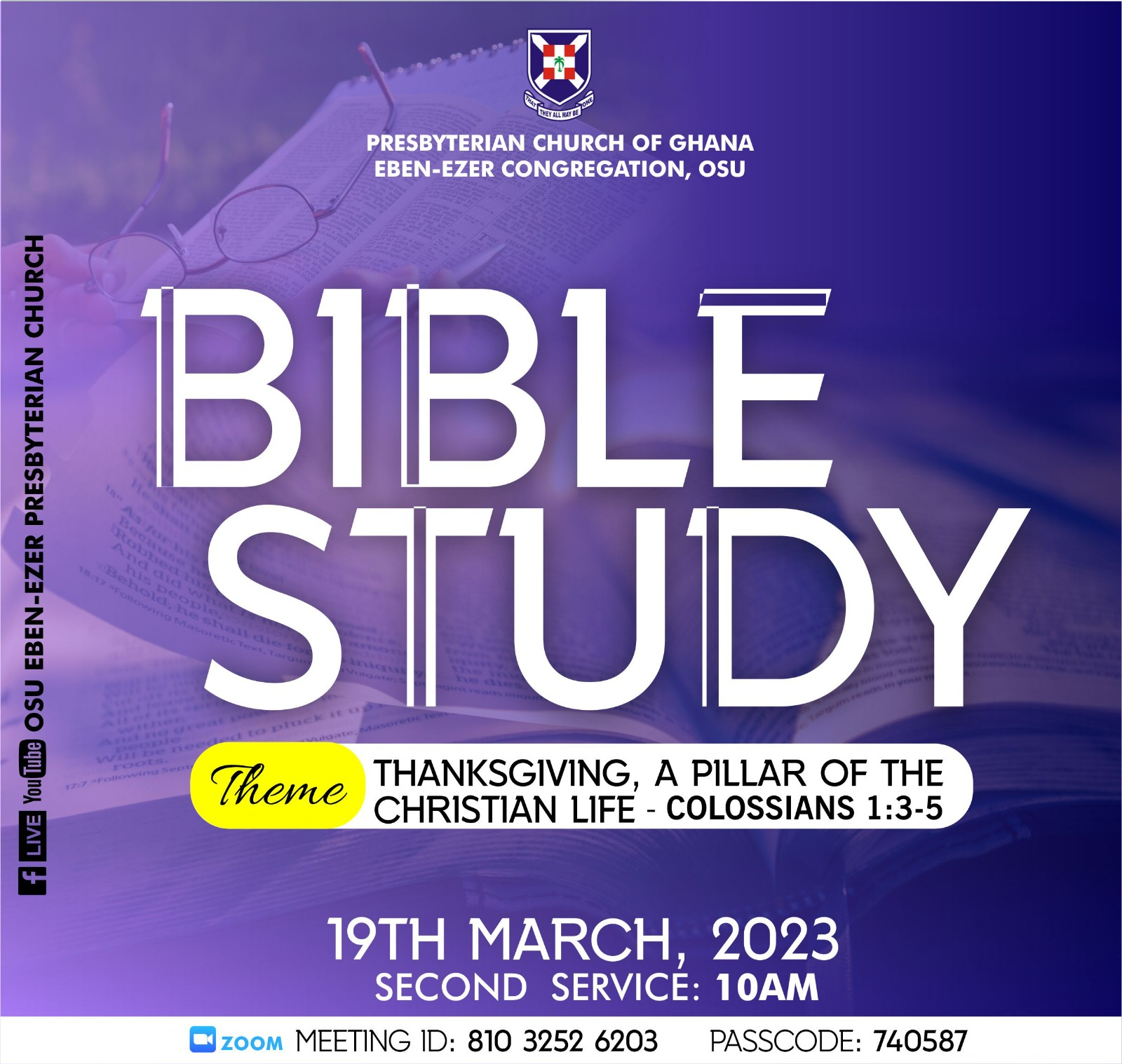SUNDAY 19TH MARCH 2023:- BIBLE STUDIES @ 2ND SERVICE @ 10.00 AM ONLINE VIEWERS CAN JOIN THE BIBLE STUDY ON ZOOM MEETING ID: 810 3252 6203 PASSCODE: 740587